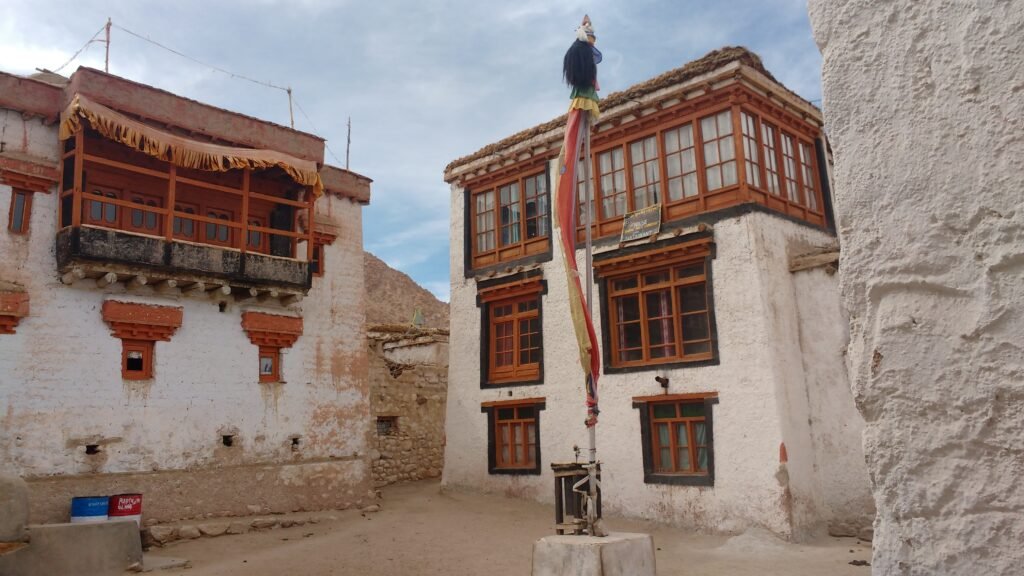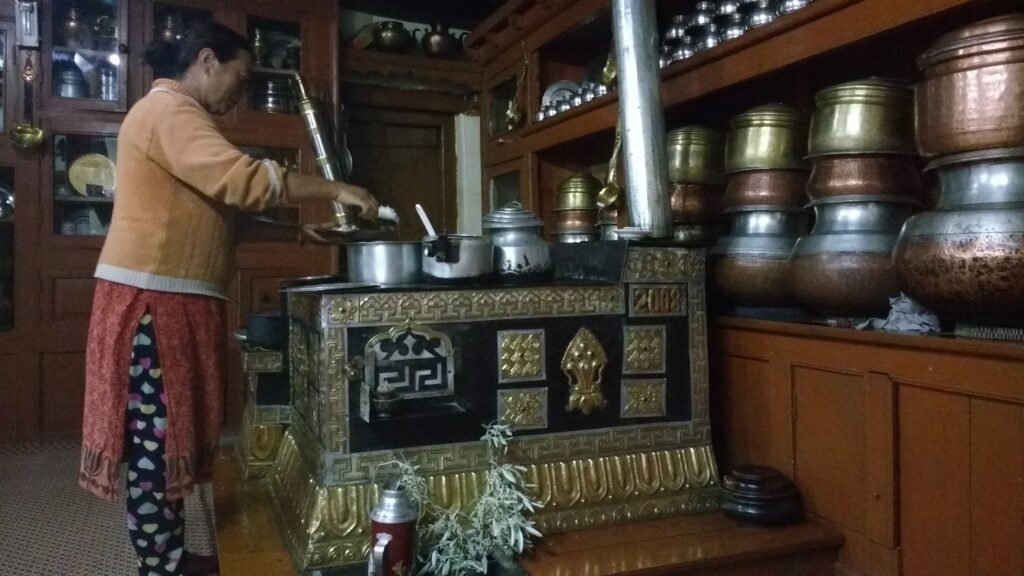 Als petits poblets de muntanya, les cases compten amb un espai central, una caldera més semblant a un tron imperial: és el cor que fa batre la casa. D’una banda, és la cuina on hi preparin els àpats; de l’altra, és la que els proporciona calor durant els dies d’hivern quan la temperatura pot baixar a trenta graus sota cero. Però no n’hi ha prou que la voluminosa caixa de ferro colat els escalfi i alimenti. Cal honorar-la també com cal, nogensmenys, sense ella la casa els cauria al damunt. És per això que tot l’espai exterior està adornat amb sanefes i símbols budistes auspiciosos, treballats delicadament amb llautó, bronze i coure. La resta de l’espai reposa sobre una moqueta que serveix de base al lloc dedicat a descansar i alimentar-se. Sobre un matalàs prim i dur, farcit de palla, unes catifes embelleixen els seients. Just al davant, mitja dotzena de taulers de fusta fan els honors als comensals.